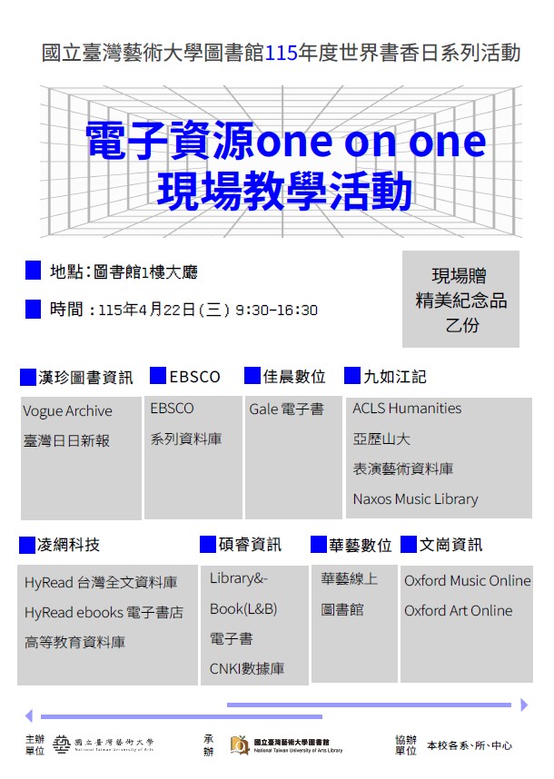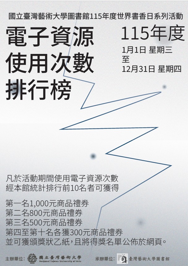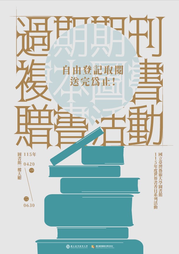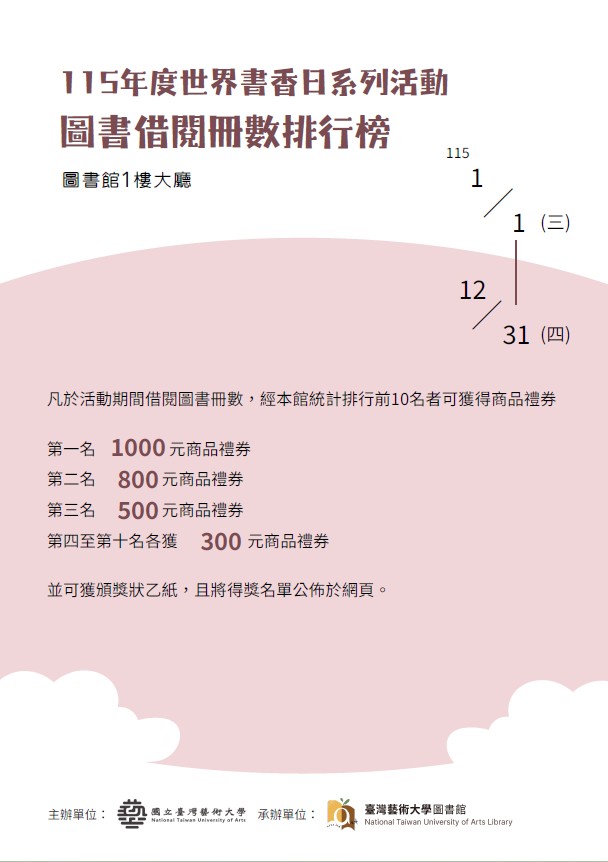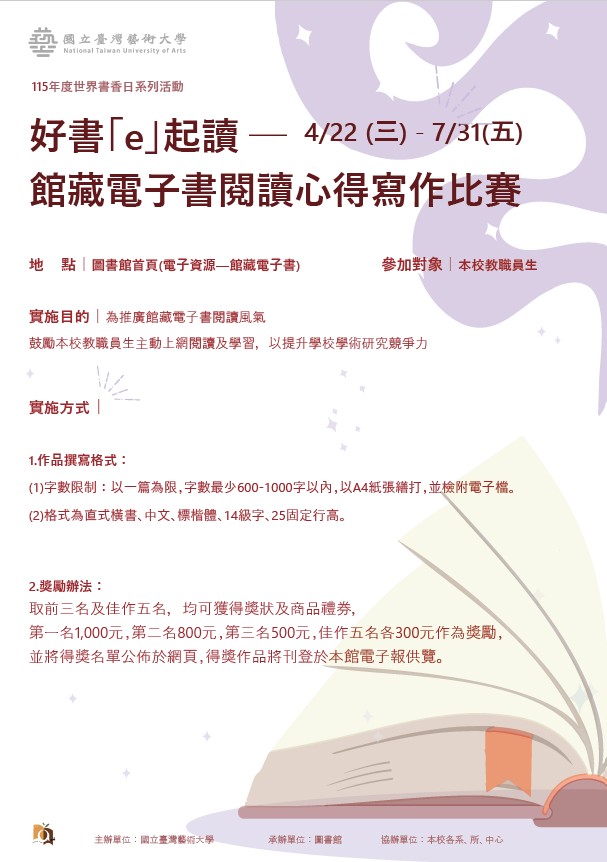 本校圖書館為慶祝115年度世界書香日(版權日),特訂於115年4月20日(星期一)起至12月31日(星期四)止舉辦一系列閱讀推廣活動,以鼓勵本校教職員生善加利用圖書館資源,親近圖書館,進而愛上圖書館,並提升圖書館館藏資源使用率,增加進館人數,並開發潛在讀者群,落實圖書館為校園大書房之經營理念。詳細活動內容請參閱附件電子檔。