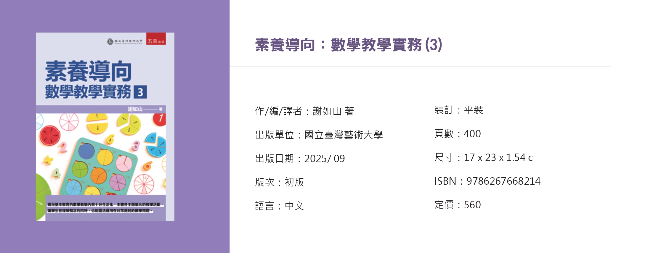 如山教授曾帶領本校學生到偏遠學校進行史懷哲出隊服務,協助對象有三峽的有木、插角、五寮與明義國小、亦曾到福連、貢寮與福隆國小,也曾到金山的三和國小、最遠也到連江縣的介壽國中小、仁愛國小與中正國中小。如山教授願意為學生服務的心,值得我們學習。 之後如山教授因應本校出版業務,依其數學領域專業,出版素養導向1 與素養導向2,到目前素養導向3 。據我所知,本系列書籍的內容結合理論與實務,提供多元的數學教學活動,期許能為本校師資培育學生,奠定紮實的數學學習基礎。