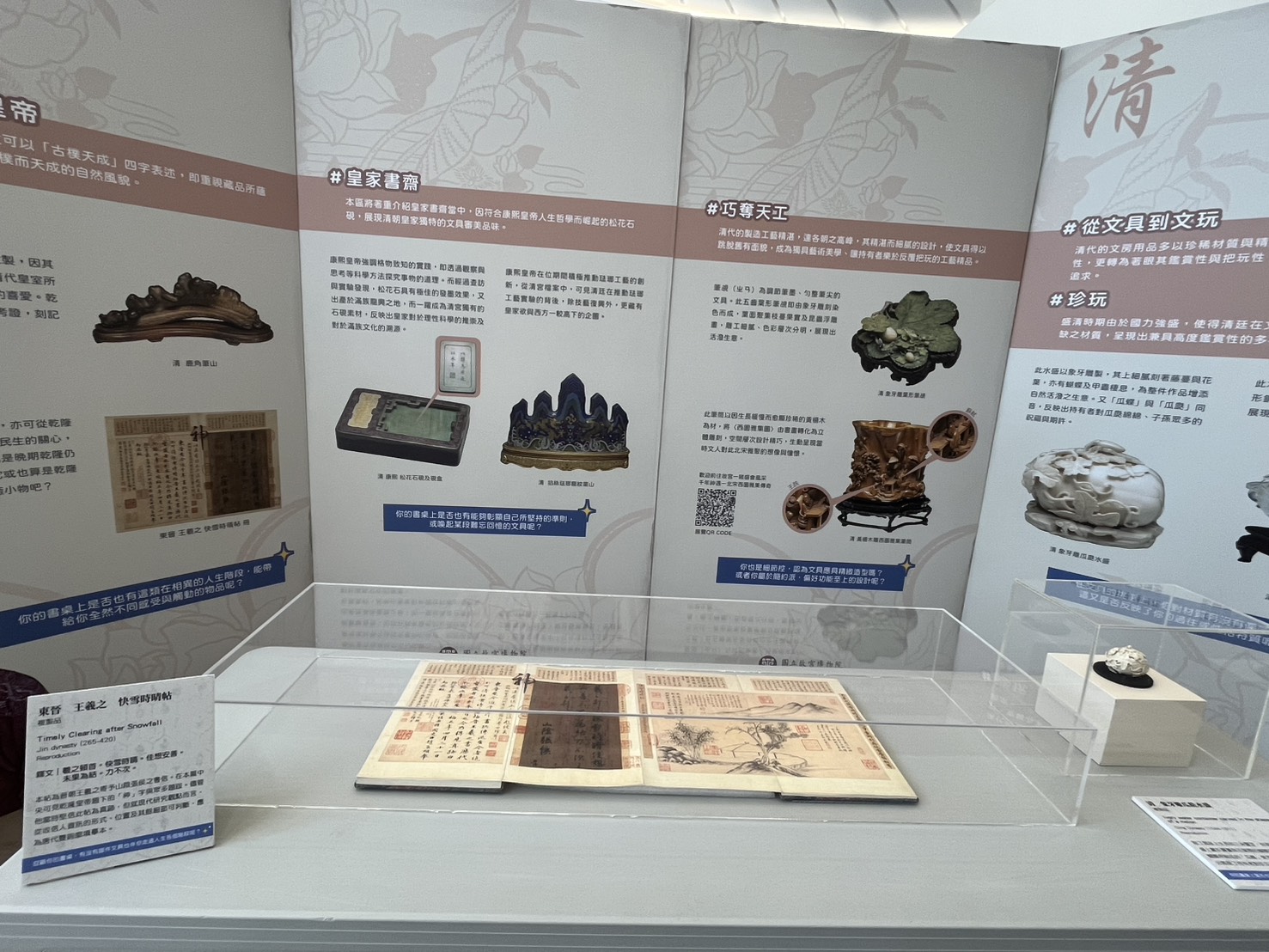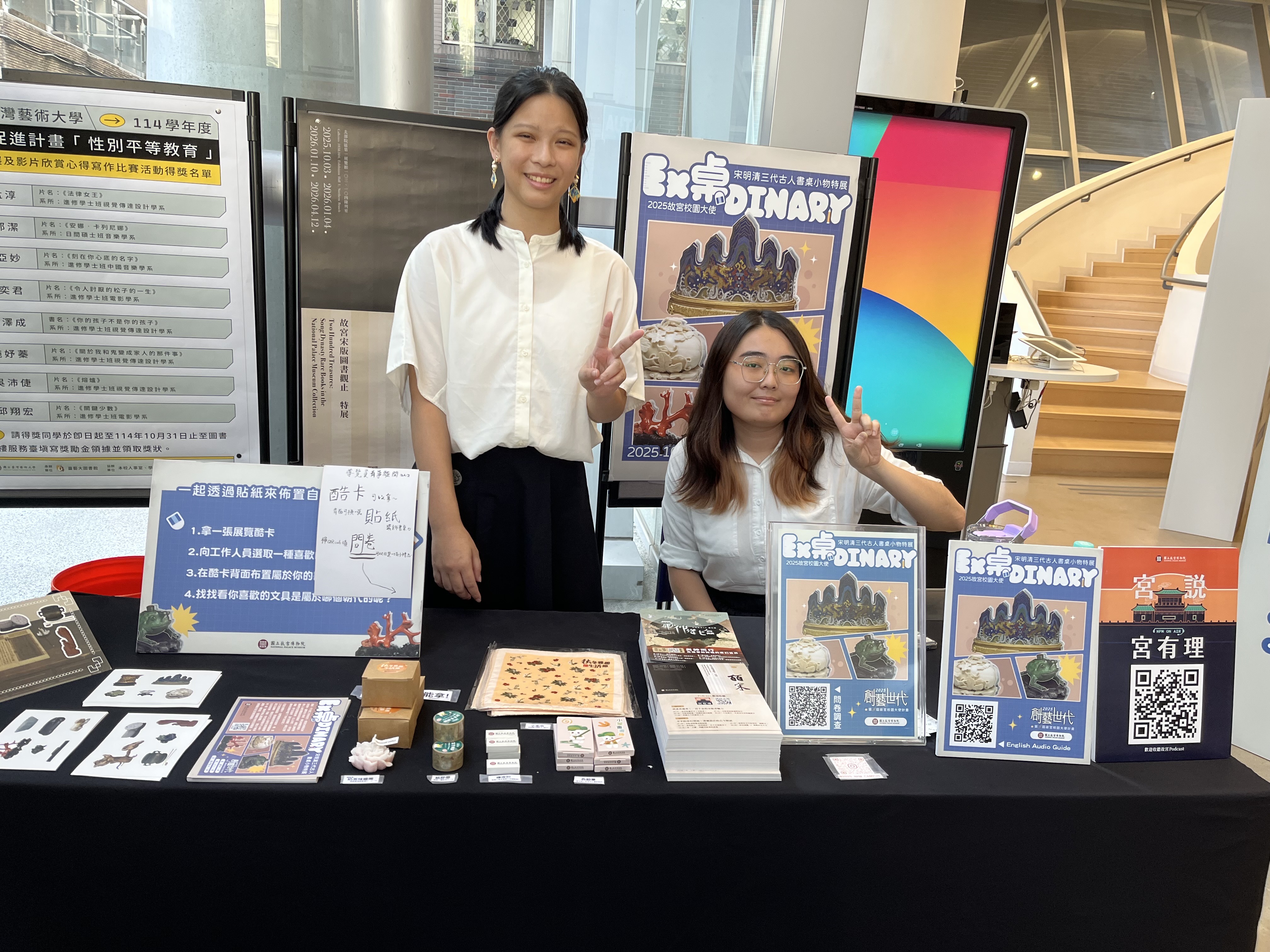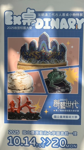 本館訂於114年10月14日(星期二)起至20日(星期一)止假1樓大廳展出國立故宮博物院「EX桌DINARY —宋明清三代文房特展」校園推廣微型展,由故宮博物院校園大使本校圖文傳播藝術學系四年級陳子芸同學與成功大學、臺灣大學之故宮校園大使共同辦理。透過本次展覽,期望能講述一個「書桌與性格」之間的故事。展覽將以宋、明、清三代為主軸,挖掘並介紹各時期文房用具的風格演變,從器物與人之間的關係中,勾勒出各朝代文人的內在精神與生活樣貌。我們同樣希望透過與觀眾的對話,連結古今,傳遞古文物不再只是博物館展櫃裡安靜陳列的形象,更與我們日常生活息息相關之概念。