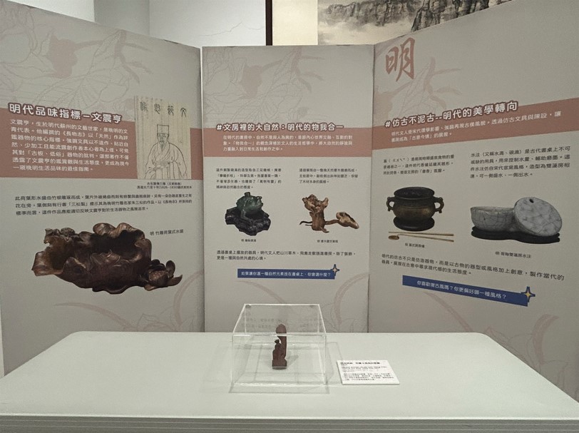 展覽整體風格希望以溫潤、沉靜而不古板的風格為基調,營造具有書齋氛圍的空間,讓人願意駐足、細看與思索。這些文物應不只是靜止的標本或展物,而能成為今人重新思考自我生活風格的橋梁。